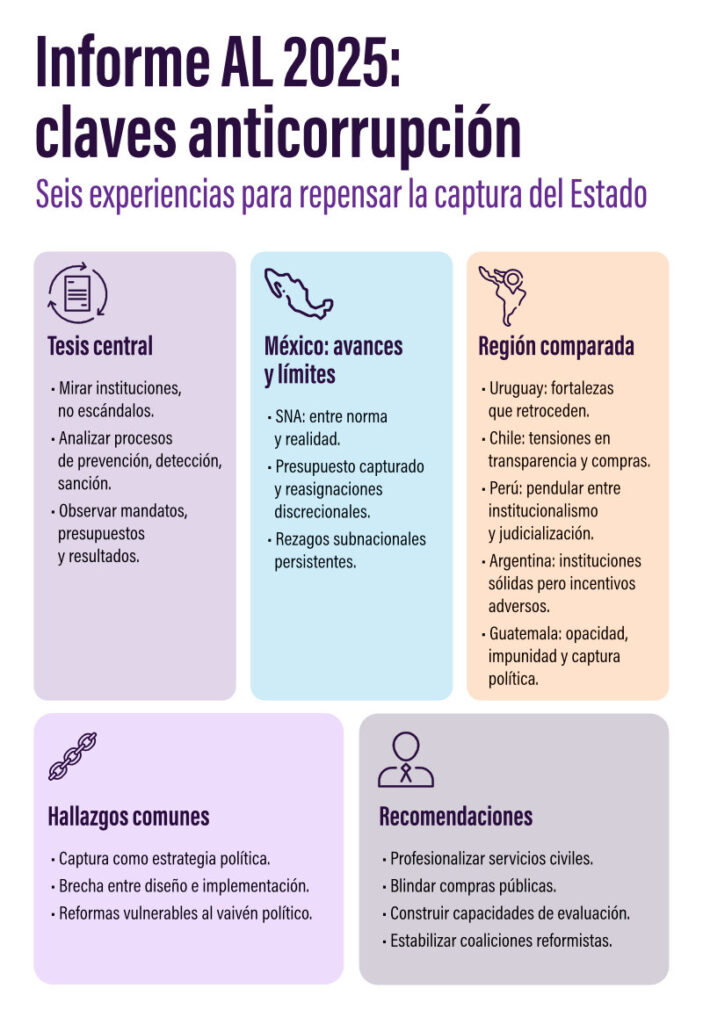La estructura acompaña esta apuesta. Inicia con México, desde tres miradas que dialogan entre sí: el avance real del Sistema Nacional Anticorrupción (SNA), la captura del presupuesto y una revisión de la implementación de políticas estatales. Después expande el panorama hacia un ensayo regional y cinco estudios de caso (Uruguay, Chile, Perú, Argentina y Guatemala). Esta transición —de lo nacional a lo comparado— no es decorativa: permite identificar patrones que se repiten, singularidades que importan y, principalmente, reconocer la idea de que el combate a la corrupción no depende de una sola palanca, sino de arreglos institucionales coherentes entre sí.